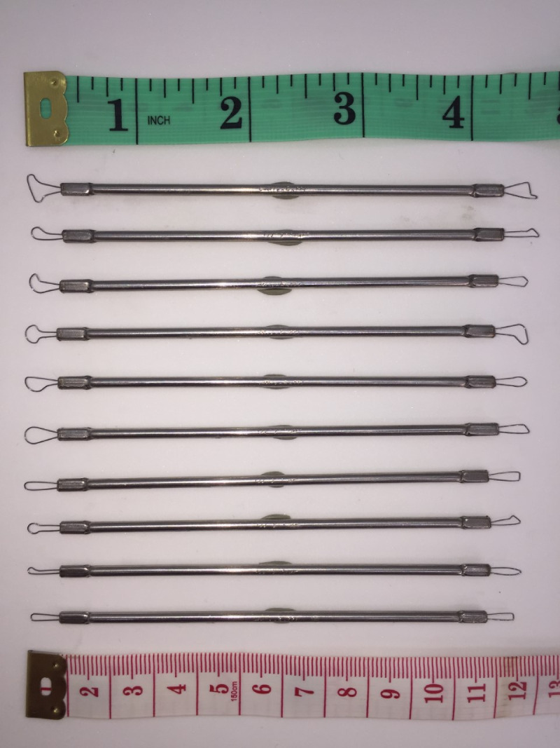 Le micro mirette hanno il manico in acciaio inox diametro 2,5 mm, sezione filo d’acciaio armonico 0,3 mm, distanza tra le punte 12 cm.